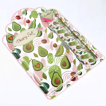 Набор канцелярский "Авокадо" 4 предмета : блокнот (11*15см) на замочке, 50листов, офсет, не менее 70г/м2, линейка (15см), карандаш, ластик. Ассорти. Упаковка -блистер с европодвесом. 19*26*2см